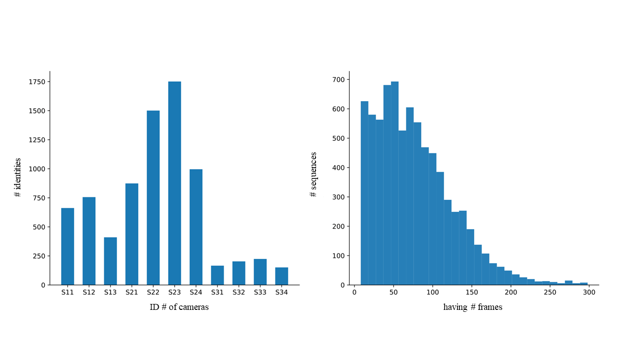 three cameras placed, four cameras in the other two scenes. During collection, the cameras with the same parameters set were placed at the two junctions of the street. Labeled Pedestrian in the Wild consists of 2,731 different pedestrians and we make sure that each annotated identity is captured by at least two cameras, so that cross-camera search can be performed. A total of 7,694 image sequences are generated with an average of 77 frames per sequence.
